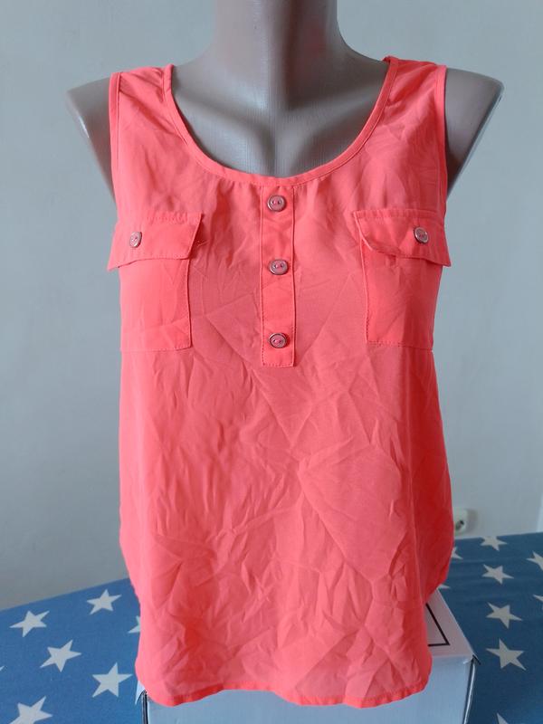 Яскрава шифонова блуза. Немного просвечивает Длина 53/60 см Полуобхват груди 42 см На груди карманы