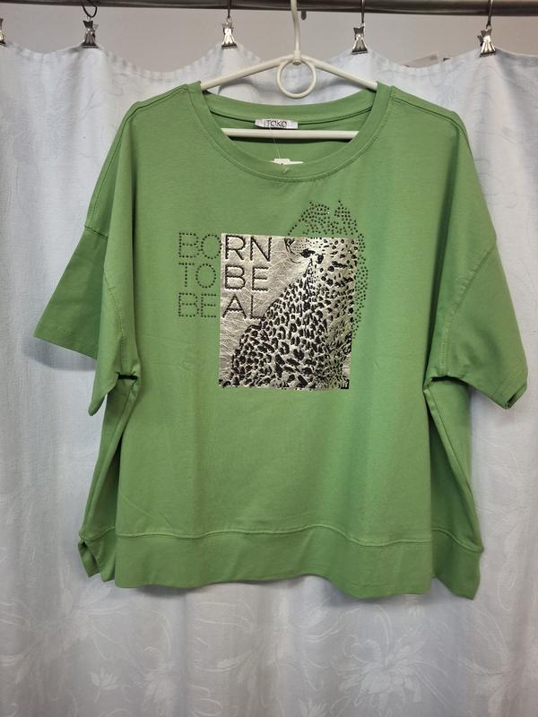 Футболка- отличного качества! Отделана,,россыпью "💥💥💥 С планкой по низу и разрезиками 👍👌 Хорошо скрывает недостатки фигуры ! Красивого цвета : молодая фисташка❤️🔥 Состав: хлопок 90, эластан 10 Длина : 60, по груди 70, по низу 68