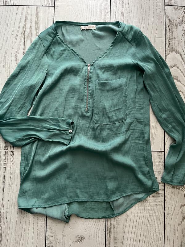 Блуза легка, склад обрізала, але приємна і не парка. Плечі 36,5см, півобхват грудей 44см + замок розстібається, довжина блузи перед 62см, зад 70см, рукав 57см.