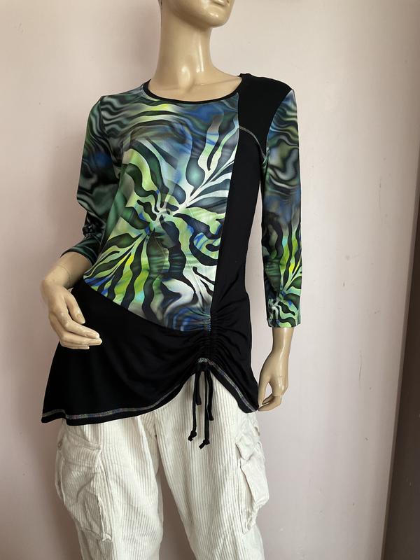Симпатичная качественная блузка. Трякотаж средней плотности. Тянется. Без дефектов. Замеры в груди 48-50 см в талии 47-48 см в бедрах 61-62 см длина 71 см рукав 48 см в плечах 37-40 см 19:6:25