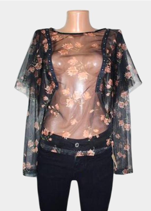 Прозора блузка з чорного фитину в коричневі квіти. Напівоб'єм грудей 47-67 Напівоб'єм талії 44-64 Напівоб'єм стегон 48-68 Довжина 58 Довжина рукава 64