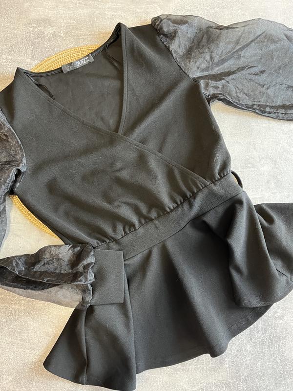 Стан ідеал. Прозорі шифонові рцкава, цупкі. Розмір універсальний. За потреби зроблю замір. Можна під ремінь. Чорна класична. Перед - щось типу аолієстера.
