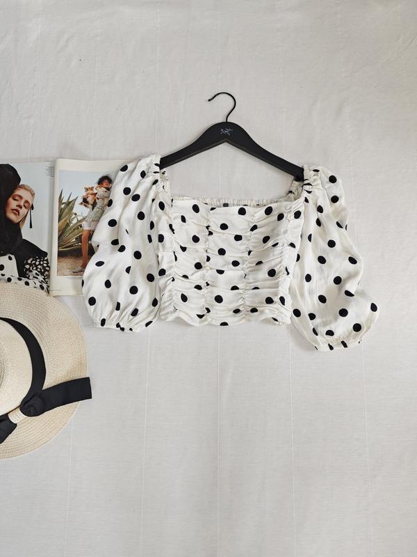 🌿сатиновый топ в горох от Zara с резинкой на спинке Размер:S Замеры:ПОГ 38 см, длина 32