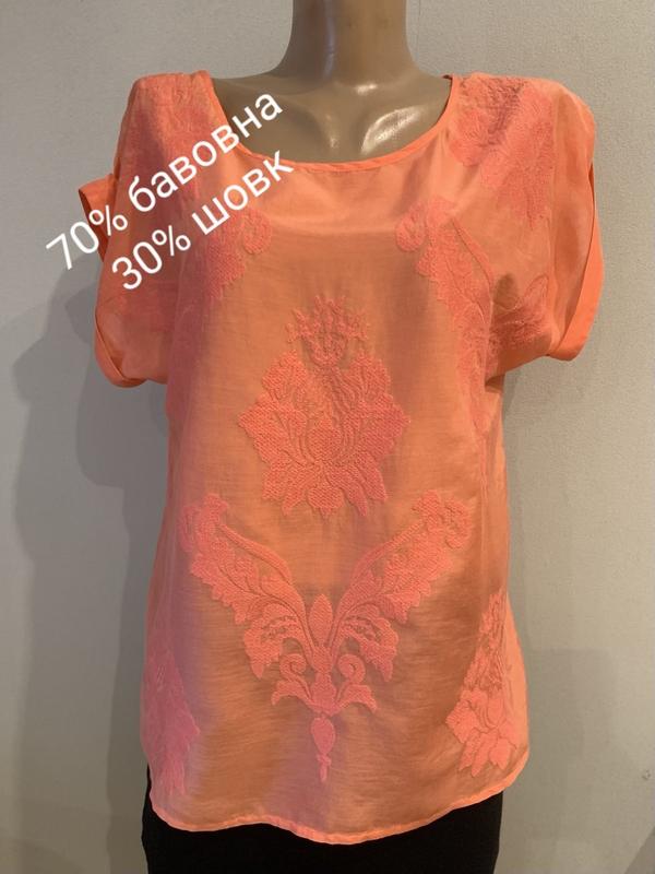 Невесомая шелковая блузка с нежной вышивкой, красивый цвет розовый коралл( в реальности немножко больше розового) Мягушка, чрезвычайно приятная на ощупь, качественная. На последнем фото небольшой Стеанс- едва заметная затяжка. Пог 48 см, ПО низу 53 см, длина 60 см