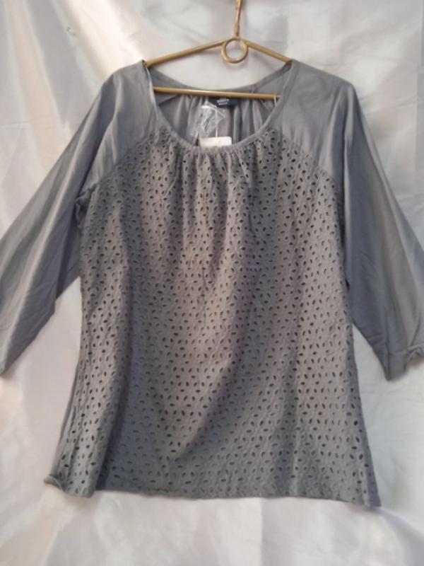 Женская блузка из тоненького хлопка, европейский размер М(40-42). Перед поданий - ажурный верх и тонкий хлопок снизу. Рукав-реглан длиной 3/4. Ширина по груди 55-57см, ширина по низу 59см, длина по спинке 65см, длина рукава-реглан от горловины 54см, ширина рукава в бицепсе 20см, по низу 15,5см, ширина горловины 26см.