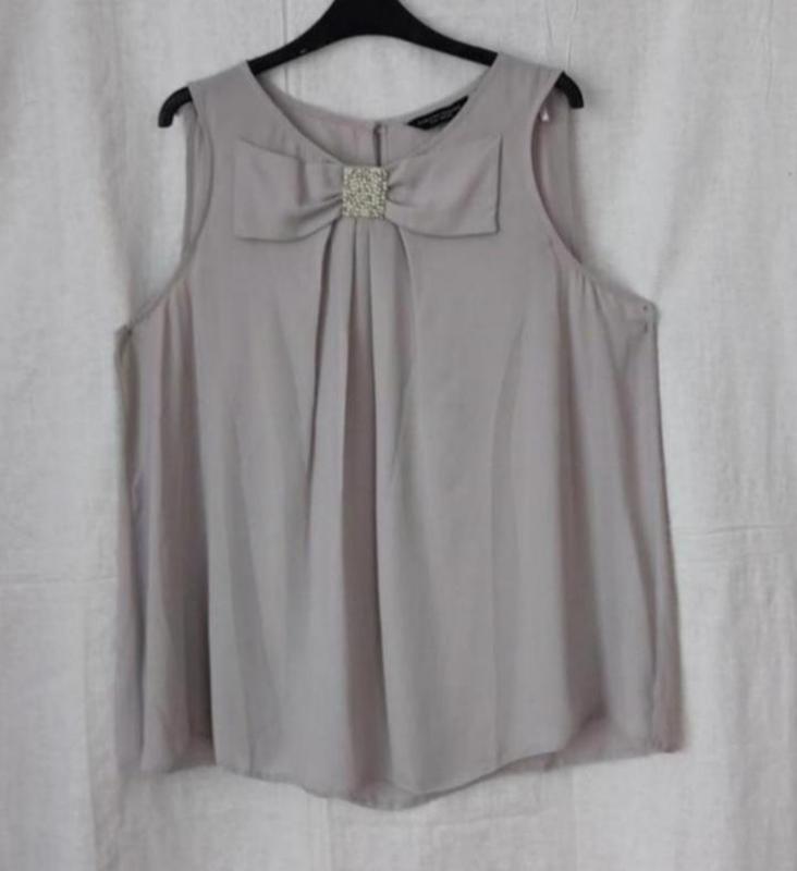 Блуза шелковая нарядная нежного серого цвета, с бантом расшитым бисером, что очень украшает изделие и придает ему оригинальности; спереди заложена складки. Известный английский бренд Dorothy Perkins. Замеры:длина 68.5;пог-58;пот-66.5;обхват низа-143;Размер рамке-20 (54) Без следов ношения