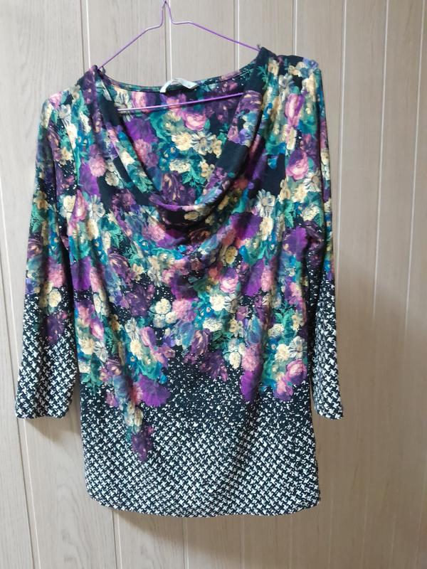 Блузочка очень классная, сочетания цветочного принта и принта, гусиной лапки ".Меет свободный воротник, который образует элегантные плавные складки, открывая шею. Состав:95%вискоза, 5%еластан. Замеры: длина по спинке 63см, спереди 53см,рукав 68см,три четвертные,ПОГ 49-56см,ПОТ 46-54см