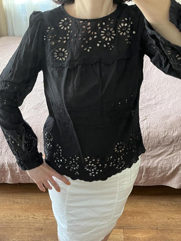 черная ажурная блузка решелье рS черная ажурная блузка решелье рS Длина 61 см Плечи 30 см Рукав 57/38 см ПОГ 46 см