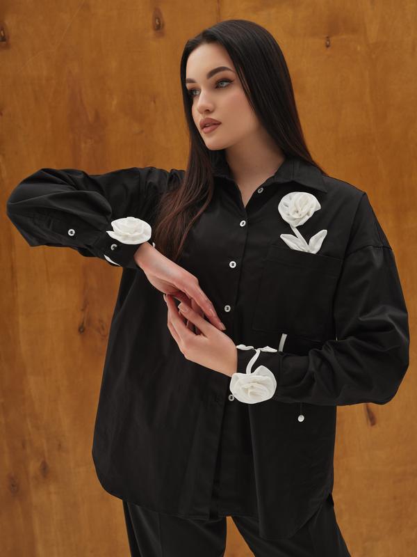 Рубашка , блуза с декоративными розами . Размер подойдет от S-L. Цвет молочный +черный. Ткань держит форму . Есть в молочном цвете.