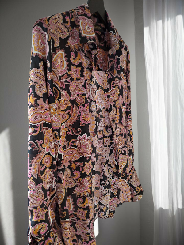 Важливо ❗️Одяг з делікатних тканин відправляю після повної оплати Сатинова сорочка з вишуканим принтом розкішної якості 🥰 від данського преміум бренду Karmamia Copenhagen 🖤🩷 Місце виготовлення Дубай Поточна колекція бренду 🔥 Стан нової речі ,в носінні не була ,без паперових бірочок 💯 Сатин , не приталена ,крій вільний ,розмір вказаний М : Плечі -39 см ; ПО груди - 49 см; ПО по низу - 50 см ; Рукав - 60 см ; Давжина від плеча - 64/ 68 см RRP 129 Євро ( ~ 6000 грн )
