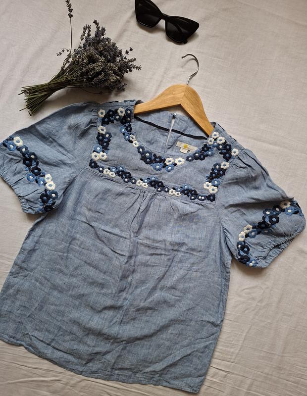 Блуза-топ с коротким рукавом Boden, размер s, возможно мал m. Склад 100 % льон. Цвет насыщено голубой, камера засветит. Декор вышивка.