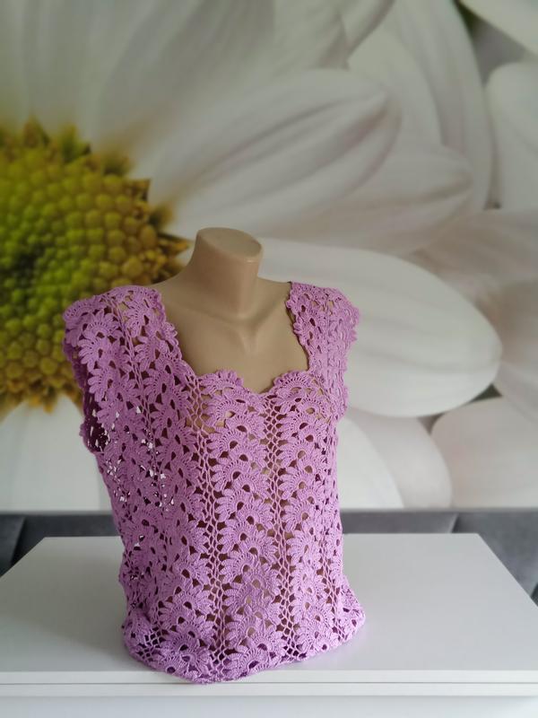 Классическая однотонная блузочка на широких бретелях свет фиолетового цвета. Легкая и удобная. Приятная к телу. Ажурная вязка ручной работы. Нить средней толщины, более к тонкой. Стрейч. Фасон прямой. Ложится по фигуре. Аккуратный квадратный вырез. Размер универсальный.