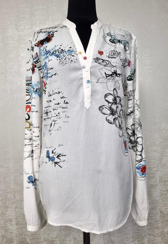 Эффектная блуза от мегапопулярного испанского молодежного бренда модной одежды Desigual, что в переводе с испанского языка означает "уникальный". Буйство красок, испанская фиеста, бесконечный праздник и выгодное море – все это нашло отражение в наряде одежды Desigual. Этот бренд для веселых, неординарных личностей, привыкших дарить позитив и жить на полную катушку. Ткань вискозная, тонкая, мягкая, с эксклюзивным принтом. Короткая застежка-планка на пуговицы расположена спереди по центру. Воротник стойка. Рукав можно подвернуть и зафиксировать пуговицей. Приталений силует. Спинка длиннее перед. Бока снизу закругленные. Изделие украшено мелкими пуговицами из настоящего перламутра. Бирка со сбором материала срезанная. Однозначно, это - вискоза. Размер XS грудь 47 см талия 44 см бедра 48 см рукав 66,5 см длина изделия 70-71 см (спинка длиннее) плечи 41,5-42 см Будет еще много фирменных вещей. Подписывайтесь! Имейте в виду, что пока вы добавляете товар в ''обаране'', кто-то его уже покупает. И вы можете пропустить свой шанс приобрести понравившуюся вещь. Чем быстрее покупать сразу несколько вещей-таким образом, вы экономите на доставке. При покупке пятки и больше вещей и оплате на карту продавцу сразу – доставка бесплатна. Удачных и приятных покупок! 5.07.25