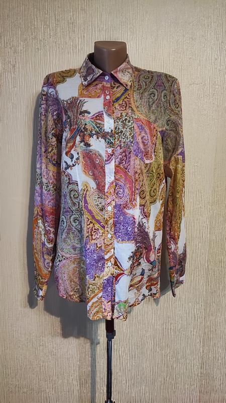 Элегантная брендовая блуза из американской коллекции Marc Aurel, украшенная ярким узором Пейсли и великолепными райскими птицами. Модель из нежного дышащего коттона, свободного кроя с классическим воротником, застегивается на пуговицы, накладной карман на груди, длинные рукава на манжетах, закругленный низ. Размер: 38. ПОГ - 54 см. ПО внизу - 56 см. Плечи - 40 см. Рукав - 62 см. Длина - 70 см. Материал - 100% хлопок. Сделано в Германии.