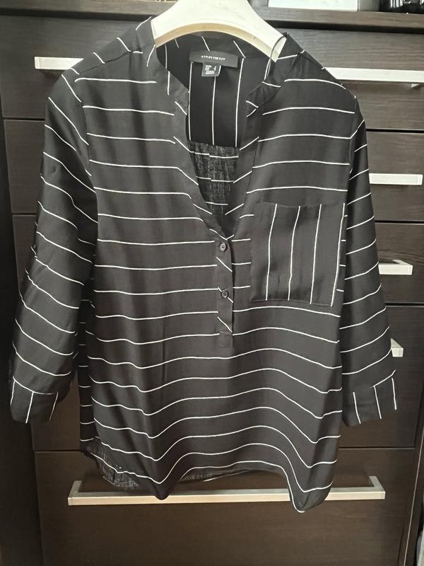 черная блузка в полоску из вискозы Atmosphere pS черная блузка в полоску из вискозы Atmosphere pS Длина 62/58 см плечи 35 см ПОГ 46 см