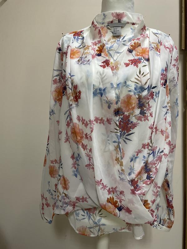 Шифоновая блуза, очень приятная на ощупь, приталенная сзади, спереди воздушные складки на запах, соединенные с подкладкой, подклад только спереди. Длина спереди 60см, длина сзади 67см, плечи 37см, пог 47см, поб 51см, длина рукава 61см, ширина рукава 16см