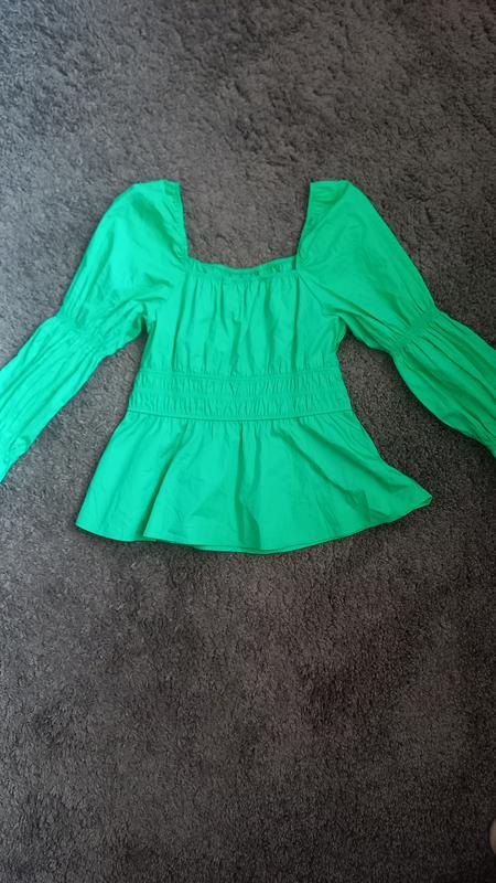 Зеленая блуза с рукавом немного длиннее чем четвертной,приемная ткань и фантастический цвет яркая, сверху на резинке можно опускать на плечах и носить во многих комбинациях.Стан идеальной пилийд на размер M и L