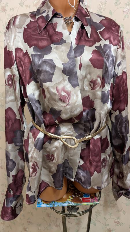 шелковистая блуза, как шелк,очень красивая, переливается,колицы великолепные,шинкарная,вечерня.Высокие манжеты на рукаве на два гквоздика,можно подобрать на половину манжета