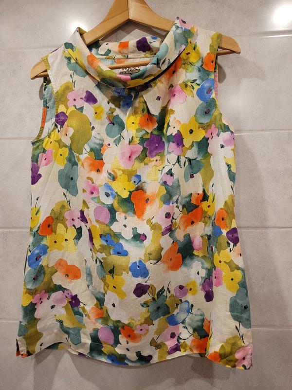 Летняя яркая блуза, в составе лён, состояние идеальное. Цвет чуточку светлее, чем на фото. Замеры: Длина 64 см Плечи 38 см Груди 47 см Низ 53 см