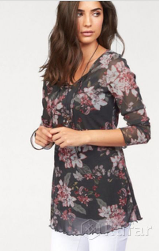 Легкая и полупрозрачная тянущаяся блуза- сеточка очень приятная на ощупь, на семи элегантных пуговицах. Спереди снизу небольшая выемка в 5 см. Вырез глубиной 22 см, на вырезе- рюши. ПОГ 54 ПОТ 46 ПОС 54 Ширина низа 62 ПЛЕЧЕ 7 Рукав 46 Состояние новой вещи