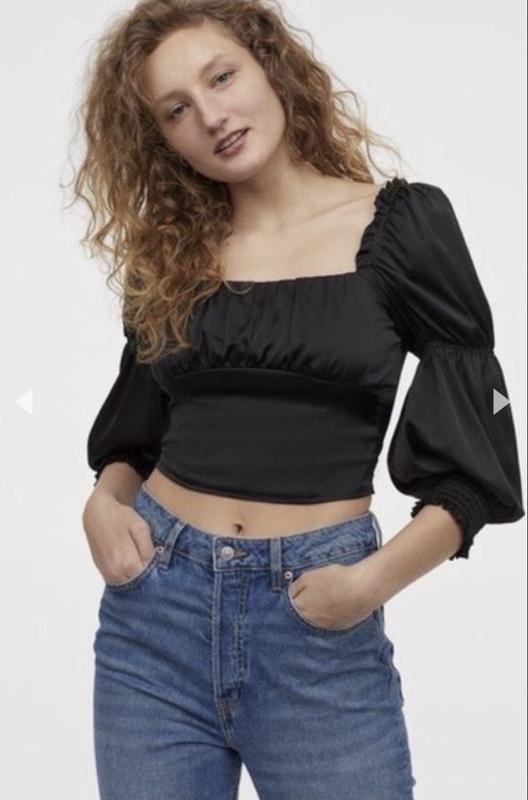 Атласна блуза з квадратним вирізом. Плісована секція спереду, збирання ззаду та шов під грудьми. Рукави довжиною 3/4 з гумкою на плечах, еластичним швом у верхній частині та прилаштованими манжетами з рюшами. Передня частина на підкладці. 📌H&M 42/10 на М або Л📌 Поліестер 📌📌📌Довжина загальна 40 без плечей 30 Ширина під руками 43+ резинка сзаді Ширина середина та низ 39 см + Резинка на спині до низу тому тягнеться і внизу
