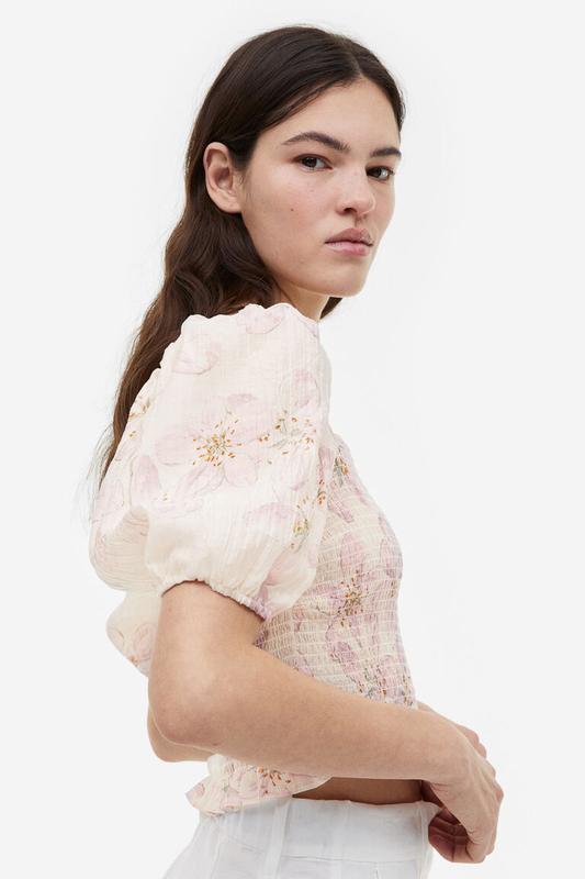 Стильна квіткова укорочена блуза з гарною спинкою та рукавами-буфами. Тканина приємна до тіла, легка та гарно тягнеться. Напівобʼєм грудей: 35 см (тягнеться до 45 см), напівобʼєм по низу: 33 см (тягнеться до 43 см), довжина рукава: 35 см, довжина топу по спинці: 45 см.