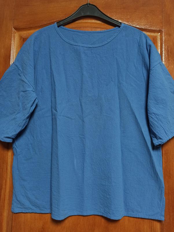 Легкая блузка, на ощупь натуральная ткань. Плечо 22 см, рукав 25 см, ПІГ 61 см--65 см, ПИТ 62 см, по низу 63 см, по бокам есть маленькие разрезы, длина от плеча 63 см. На ощупь ткань хб. жатка.