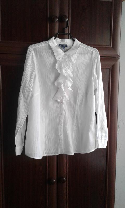 Элегантная белая блузка от швейцарского бренда BIAGGINI (Charles Vögele). BIAGGINI — торговая марка, принадлежащая швейцарскому ритейлеру Charles Vögele, который был широко представлен в Европе. Одежда этого бренда известна своим качеством, классическим стилем и комфортом в носке. BIAGGINI предлагает базовые и универсальные вещи на каждый день и для работы. Эта рубашка — универсальная вещь, которая легко адаптируется под деловой, вечерний или даже повседневный образ.Лёгкая, дышащая ,слегка прозрачная ткань из 100% хлопка, приятная к телу. Воротник-стойка украшен декоративными воланами, которые придают образу женственность и нотку романтики. Классическая застёжка на планку на пуговицы.Подол закругленный . Подойдёт как для офиса, так и для повседневного или вечернего образа.Нюанс :на волане с изнаночной стороны черная точка (смотри последнее фото) .При носке не заметно .Замеры :Ширина плеч -43,5 ПОГ- 58 ПОТ-51,5 ПОБ- 56,5 Длина- 67,5 Длина рукава- 60 .