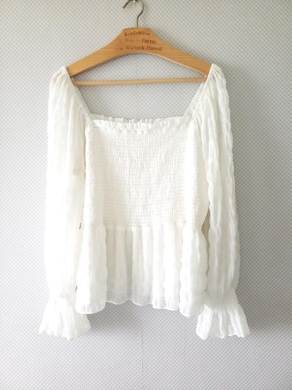 Блуза в романтичном стиле из текстурированного шифона молочного цвета. Пышные длинные рукава с манжетами. С середины продублирована трикотажной тканью. Стан идеален. Размер по набору 20. Замеры: под руками - 52см, длина от середины плеча - 60см.