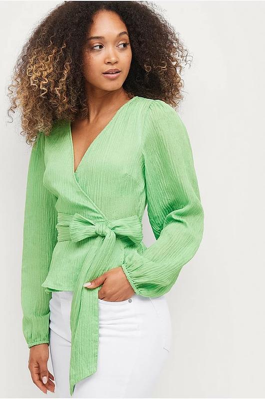Блуза зеленого цвета на запах, с баской и завязками. Выполнена из жатой тонкой ткани. С середины фиксируется на пуговицу. Стан идеален. Размер по набору L. Замеры: под руками - 49см, рукав - 66см, талия - 42см, длина по спинке - 55см.