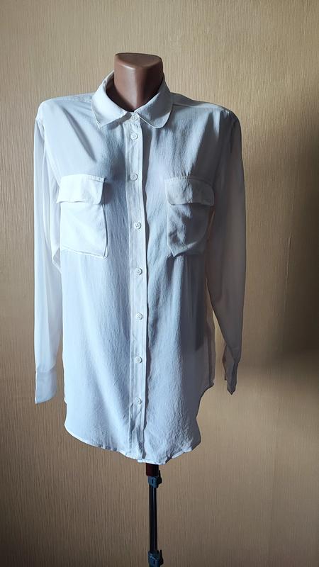 Вневременная классика шелковая блузка-рубашка французского бренда Equipment Femme цвета айвори. Универсальная модель прямого кроя с острым воротником, застежкой на пуговицах, длинными рукавами с манжетами. Накладные карманы с клапанами спереди, кокетка сзади. Низ рубашки закруглен. Оригинал. Размер: S. ПОГ - 52 см. ПО внизу - 52 см. Плечи - 43 см. Рукав - 56 см. Длина - 75 см. Ткань - 100% шелк.
