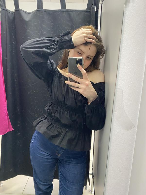 Оскільки блузочка на резинках, то дуже добре тягнеться Від S до XL Стан ідеальний Гарно носити з відкритими плечима