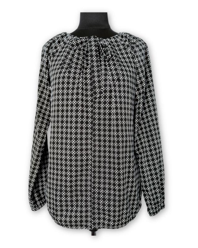 Блуза в идеальном состоянии. Дефектов нет. Размер указан 40, подойдет на наш 46,48 г. Состав 100% полиэстер. Блуза реглан на шее завязки, которыми можно регулировать ширину ворота. По низу блузи резинка, в рукавах по низу резинка. Замеры длина 65 см ширина в груди 52.5 см длина рукава от шеи 65 см