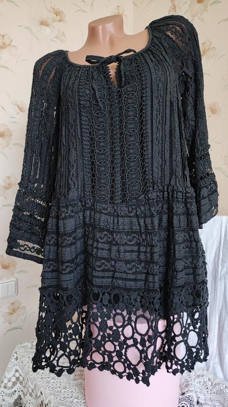 Бохо-блузка из Италии из плотного кружева, на подкладке. Эффектный черный цвет и сложный узор делают модель особенно стильной. Рукав 3/4, расклешенный, добавляет легкости образу. Горловина с вырезом и завязками. Низ изделия украшен ажурной каймой из вязаного кружева.. Свободный крой подходит на размер XL–XXL и больше. Отличный вариант для ценительниц бохо-стиля и натуральных тканей. Смотрится очень эффектно и стильно. Состояние новой вещи без дефектов.