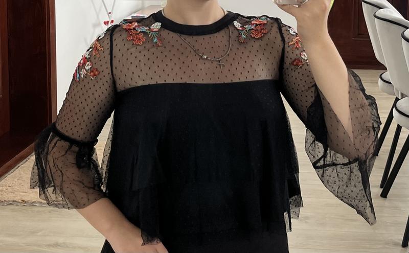 Чорна блуза з сіточкою та квітковою вишивкою (розмір S) Вишукана чорна блуза у кілька шарів із прозорою сіточкою в горошок — для тих, хто цінує деталі. Напівпрозорі рукави доповнені витонченою квітковою вишивкою, що додає образу романтичності та шику.