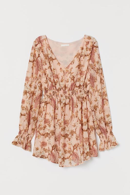 Легка тканинна блузка з V-подібним вирізом. Блуза має димчасту частину під грудьми і довгі димчасті рукави внизу з воланом на кінці. Частково підкладена Довжина рукава: Довгий рукав 60 см Деталь: V-подібний виріз Колір: Пудровий рожевий в квіти Довжина 75 см Розмір S Груди 40 тягне до 50 Резинка під грудьми 39 см тягне на 52