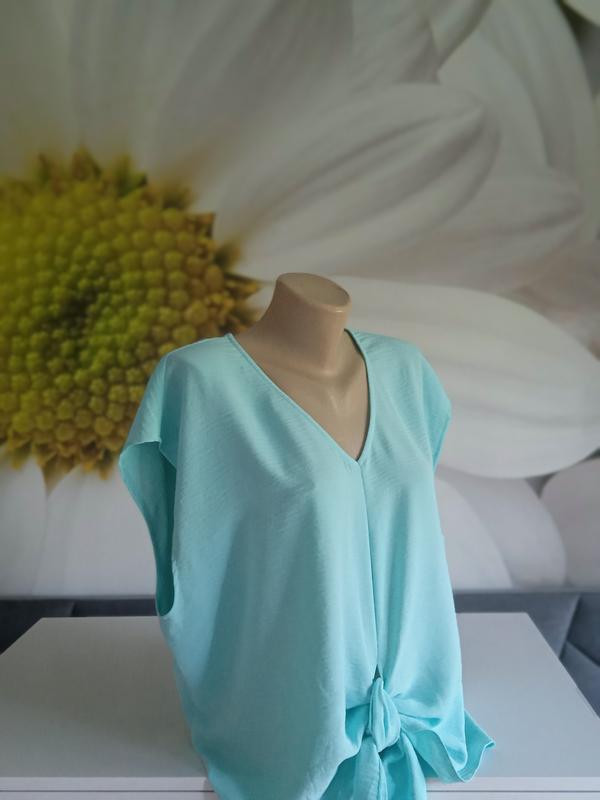 Классическая однотонная блузочка с коротким рукавом светло бирюзового цвета. Легкая и комфортная. Приятная к телу. Тонкая, но плотная ткань. Практически не тянется. Ложится свободно. По низу украшена завязками. Аккуратный вырез Есть размеры.
