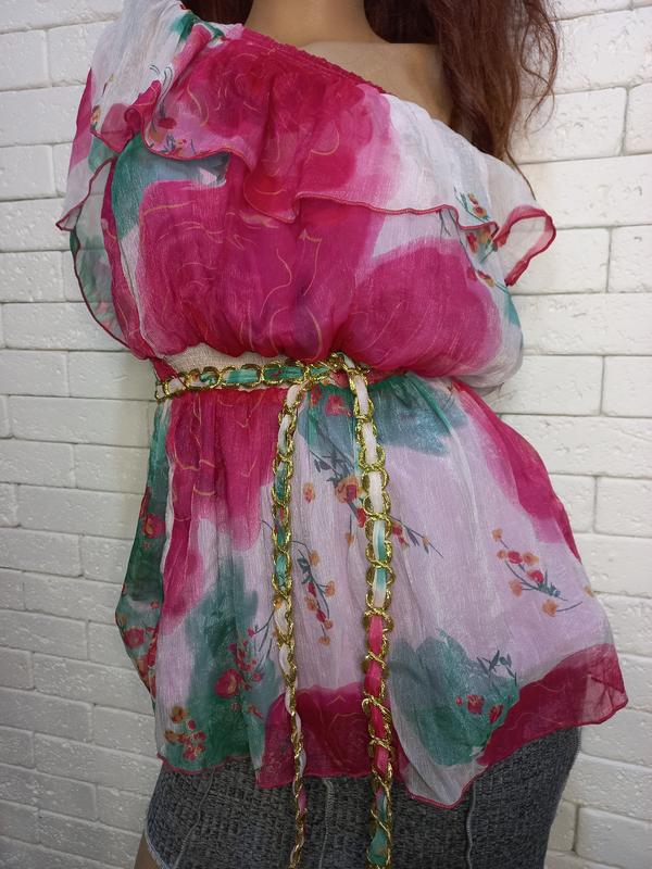 Красивая, легкая, воздушная,блузка на одно плечо с поясом,с воланами