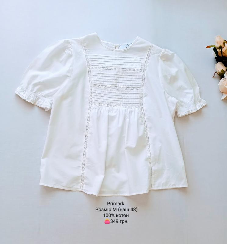 Блуза прошва от Primark. Размер М (наш 48). Состав: 100% коттон. Замеры: длина по спинке 60 см, ПОГ 55 см, ПОТ 57 см, ПОБ 60 см, плечо 11 см, длина рукава 30 см. Состояние новое.