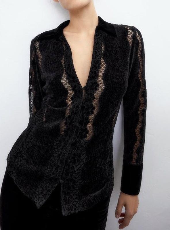 Черная бархатная блузка zara с кружевом и воротником на пуговицах