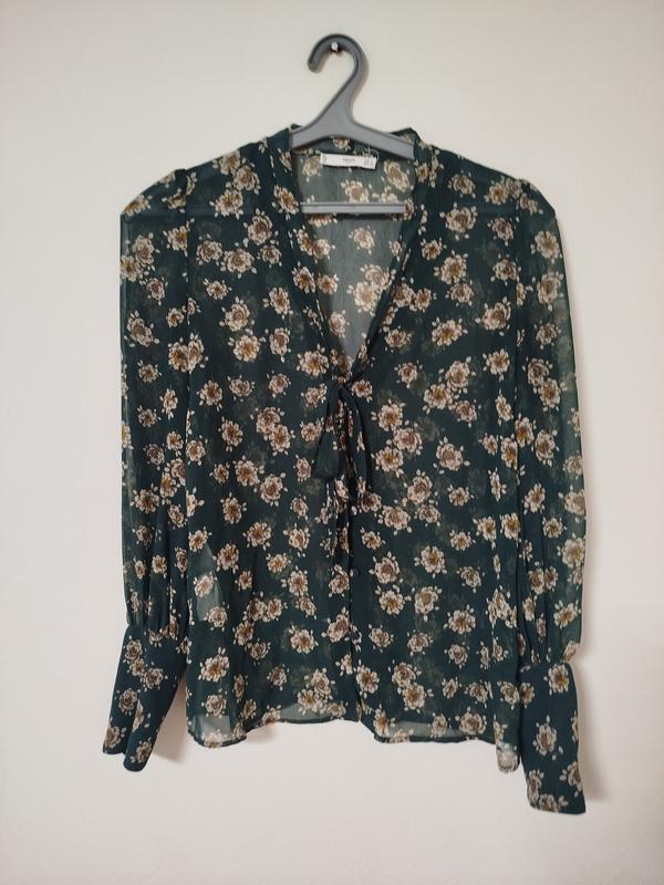 Прозрачная нежная шифоновая блузка с воротником бантом, на рукавах длинные манжеты на три пуговицы. Размер S, длина 61, полуобхват груди 48, длина рукава 62.
