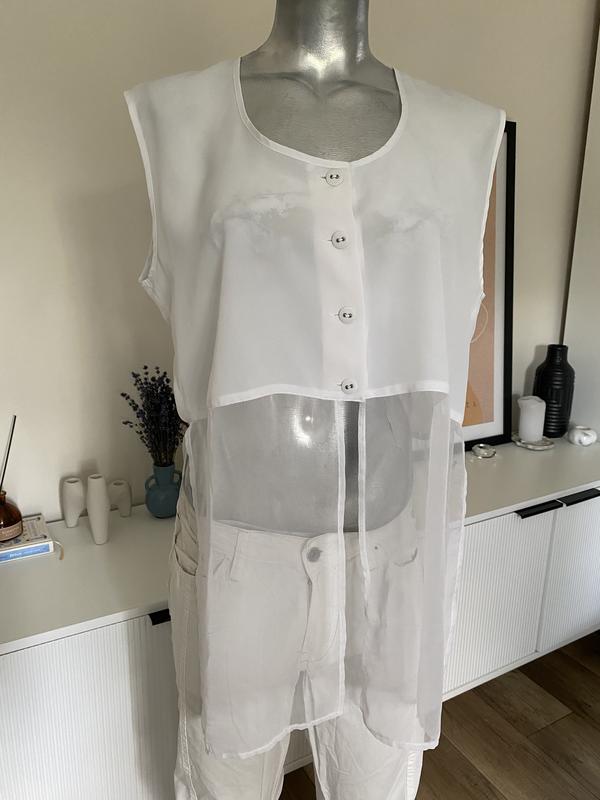 Блуза білого кольору, без дефектів, тканина просвічується, легка і приємна до тіла . Розмір М