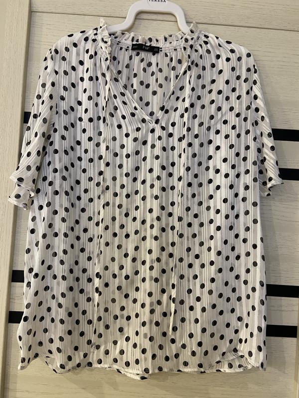 Дуже нарядна блуза в горошок,невісома,в ідеальному стані.Всі заміри на фото,якщо є питання, звертайтесь.Оплата на картку.