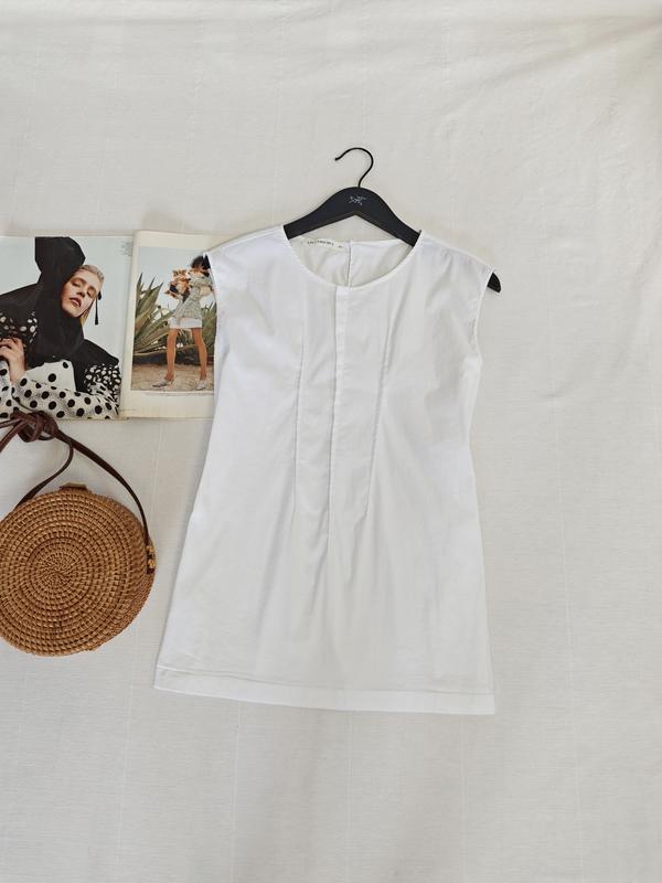 белая блуза дизайнера Lis Lareida из стрейчевого коттона, ПОГ в спокойном состоянии 47 см, длина 64 см