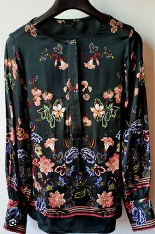 Блуза из вискозы с цветочным принтом от Massimo Dutti стойкая Ткань натуральная под атлас. Длина-63см, полупрозрачная в районе груди 46см рукав-63см. Ткань не тянется. Красивый объемный рукав с манжетом золотой пуговицей По бокам есть разрезы полуширина внизу 48-49