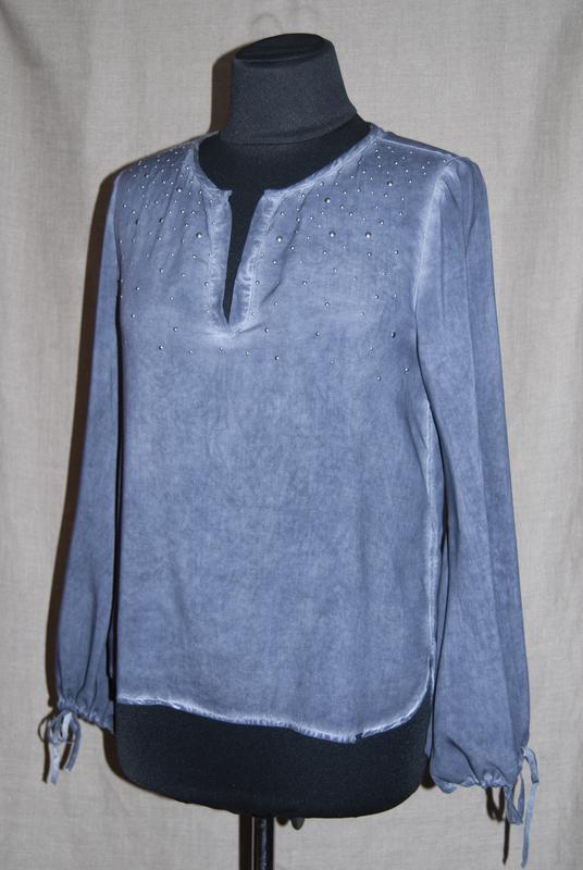 Блуза с эффектом acid wash Q/S для S.Oliver. 36 размер. Сделана в Индонезии. Оригинальные рукава, удлиненные спинка. Ценник - 24.99 евро. Длина сзади - 71 см, спереди - 61 см. ПО талии - 50,5 см. Ширина в пахвах - 52 см. Ширина плечей – 43 см. Длина рукава – 62 см. Состав - тончайшая 100% вискоза.