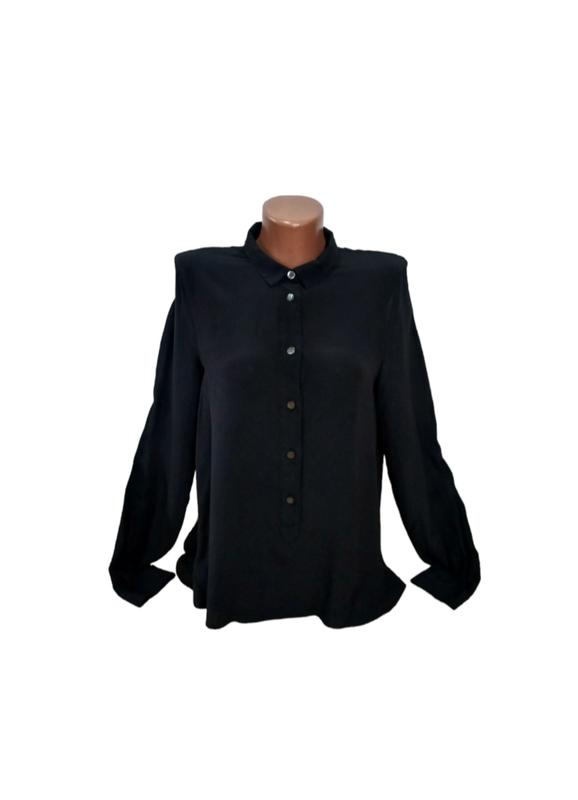 Блуза женская, черного цвета. Перед и рукава блузы из 100% непрозрачного шелка Малбери, спинка прозрачная со складками из 100% полиэстера, спинка длиннее перед. Гудзики из перламутра. Длина перед - 62 см, длина зад - 73 см, полуобхват под руками - 46 см, длина рукава - 63 см.