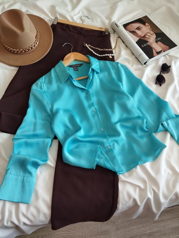 Стильная блуза Primark яркого голубого цвета. Изящная модель прямого кроя из гладкой сатиновой (атласной ) ткани. Отлично сочетается с любым низом. Новая без бирки Размер 8/S. Длина 55 ПОг 46 Рукав 60