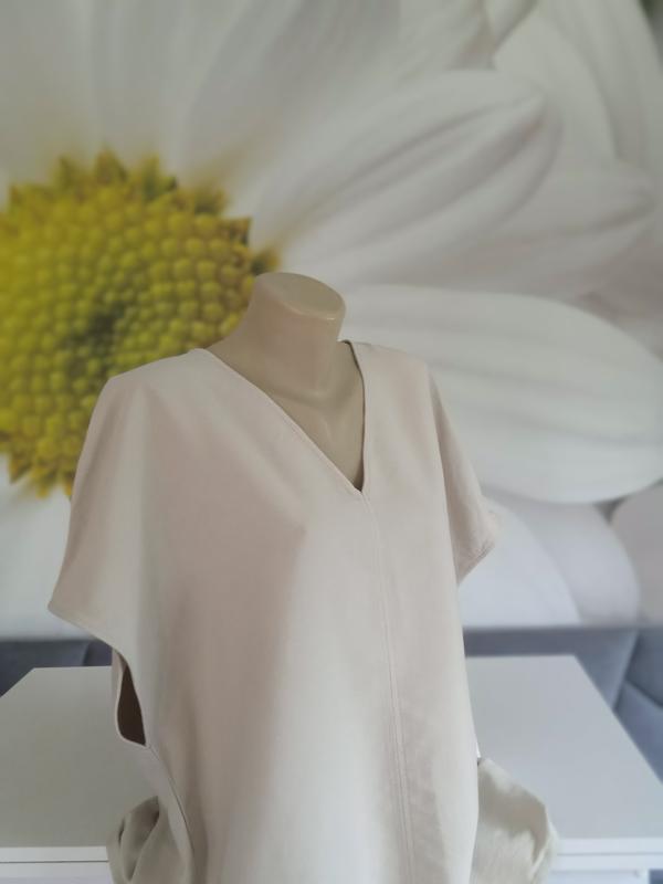 Классическая однотонная блузочка с коротким рукавом бежевого цвета. Легкая и удобная. Приятная на ощупь. Тонкая, но плотная ткань. Практически не тянется. Ложится свободно. Фасон прямой. Аккуратный вырез Есть размеры. 58р на пог-64-66 56р на пог-62-64 54р на пог-60-62
