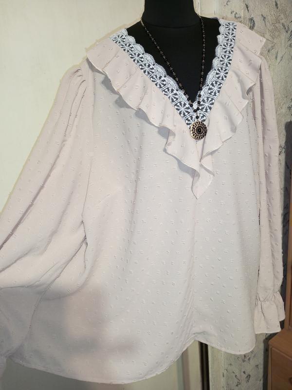 Женственная, нарядная, пудровая -беж-крем, фактурная блузка-трапеция с белым кружевом и оборкой по декольте, с объемным рукавом и манжетом, мега батал, SHEIN. Размер 3XL, но ориентируйтесь по измерениям: ПОГ от подмышки до подмышки - 68/70см + есть вытачки; ПОБ, по канту - 74/76см, длина от плеча- 70см, длина рукава - 65см, ПО бицепса -25/27см Одетая пару раз, красивая, отличная вещь. Девочки, пожалуйста, переспрашивайте - сложи дополнительные фото и замеры. Возвращение нет – объявления платные. Ди.другие объявления - есть аналогичные блузки, брюки, пиджаки...,а также 90% одежды большого размера. Подписывайтесь - ежедневные обновления одеждой больших размеров не только. Покупая несколько товаров - Вы экономите на пересилке, лови комбинируются. Перед покупкой - прохватка: ознакомиться с рубрикой "ПРО МЕНЕ" Состав: Полиэстер Доставка: Перешлю в ин. города за Ваш счет - при полной оплатке на карту